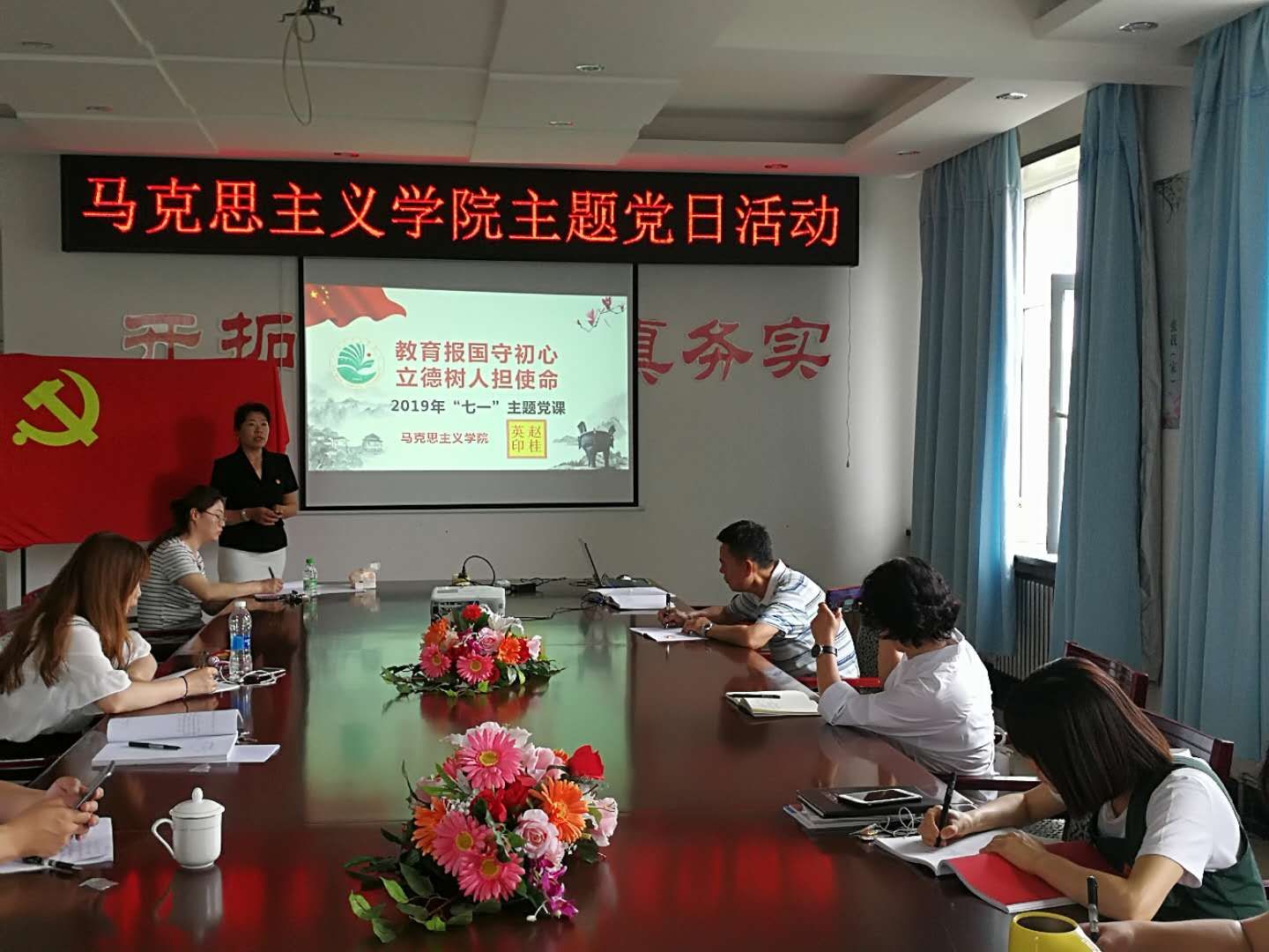 6月25日下午1点半,马院全体党员教职工齐聚五教319会议室,共同迎来了2019年”七一”前夕的一次主题党日活动。整场活动由史纲党支部书记邵红侠同志主持。