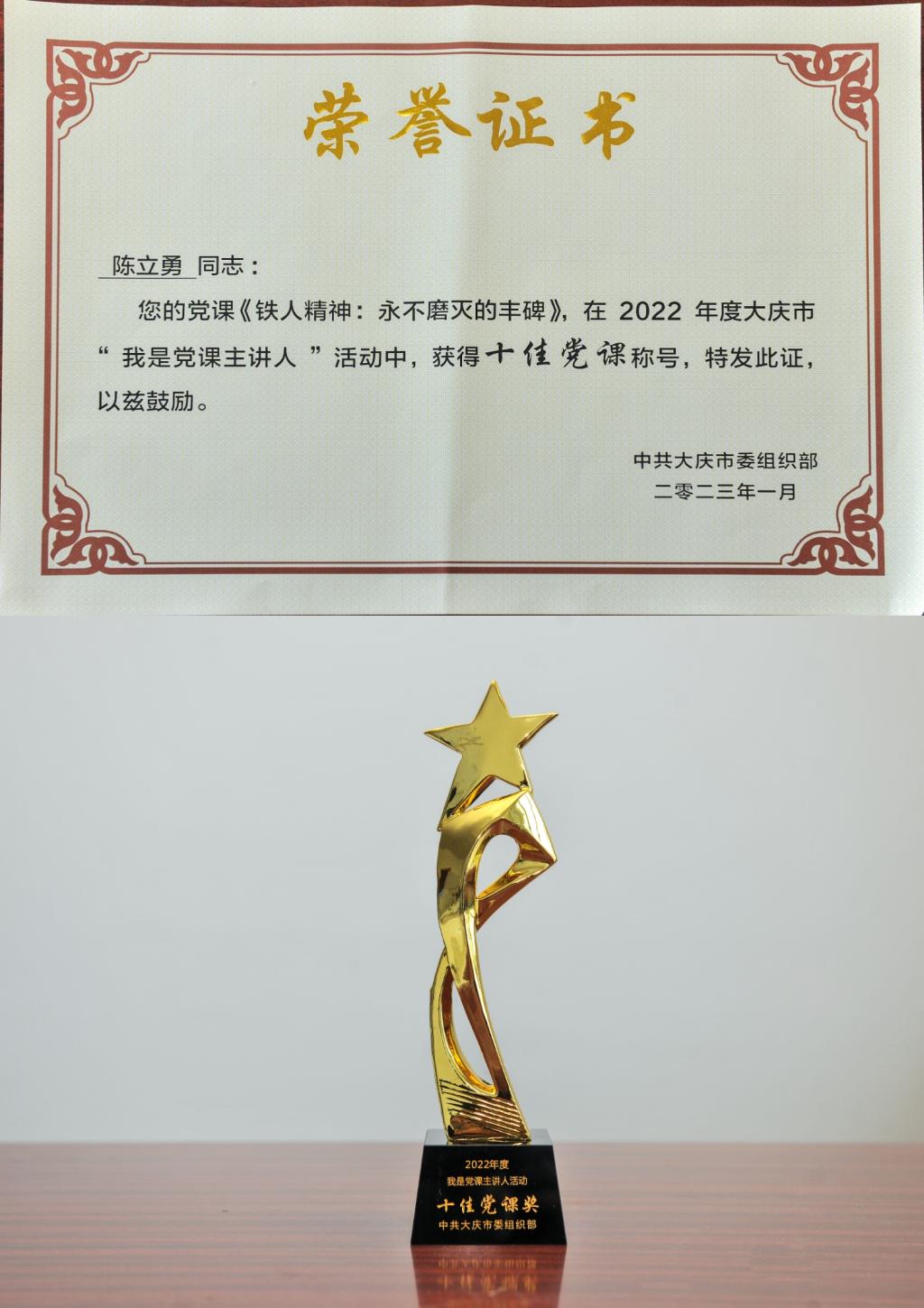 近期,BETVICTOR伟德陈立勇教授讲授的党课《铁人精神:永不磨灭的丰碑》被评为2022年度大庆市“我是党课主讲人”活动十佳党课,同时,荣获黑龙江省2022年度“党课开讲啦”三等奖。