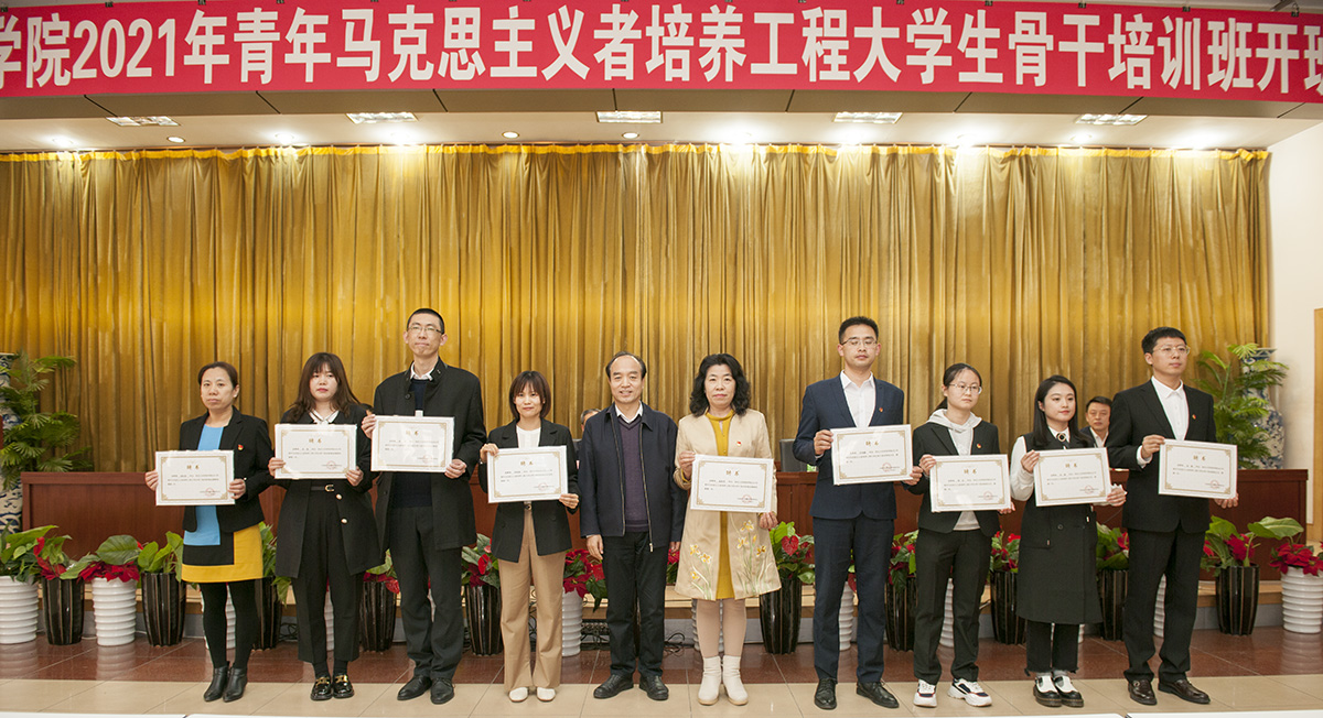 仪式现场,党委书记徐克明为2021年“青马工程”学员代表授旗,标志着本届“青马工程”培训班正式开班。党委副书记王革为本期培训班理论课教师和班主任颁发聘书,并对老师们表示祝贺。