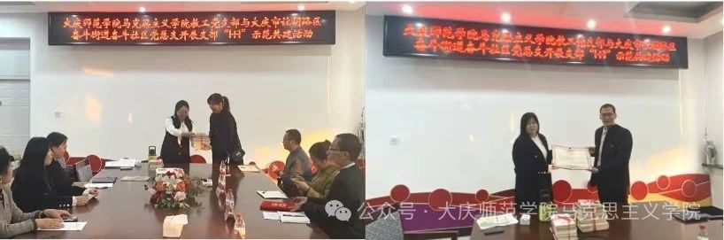 马院支部宣传委员曹丽秋同志向让胡路奋斗社区支部党员代表董雯雯捐献马院教工党员赠与的图书;奋斗社区副书记董占山同志向马院教工支部副书记张清颁发捐赠证书。