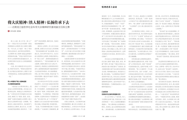 近日,公司黑龙江省哲学社会科学大庆精神研究基地副主任、BETVICTOR伟德副教授陈立勇作为红色文化研究专家接受人民日报《人民周刊》专访,就大庆精神(铁人精神)相关理论与实践问题展开系列解读。相关专访内容,以《将大庆精神(铁人精神)弘扬传承下去》为题发表在近日出版的《人民周刊》第9期“精神谱系大家谈”栏目中。