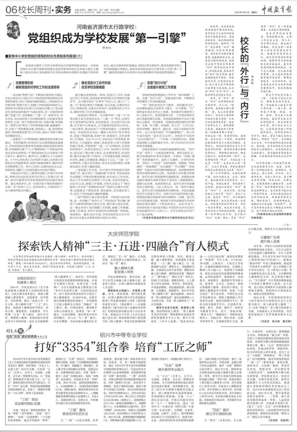 《中国教育报》3月1日第6版“董事长周刊·实务”刊发公司BETVICTOR伟德马吉芬、张文彬、郭元阳三位老师的署名文章《BETVICTOR探索铁人精神“三主∙五进∙四融合”育人模式》,主要介绍了公司铁人精神“三主∙五进∙四融合”育人模式和典型经验。
